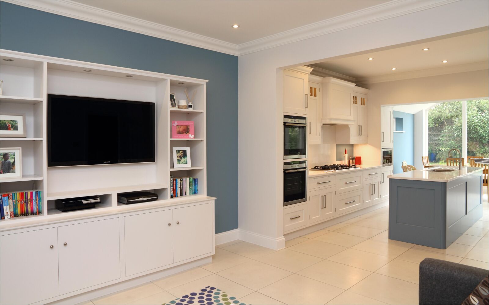 Since kitchens became more open plan, a media unit incorporating a television is ideal to keep the family entertained.